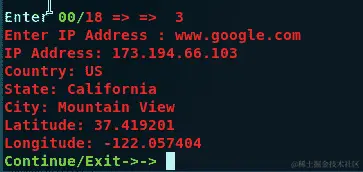 要查找有关域或 IP 的基本地理信息,请选择选项 3 并按 Enter,然后输入 IP 或域名: