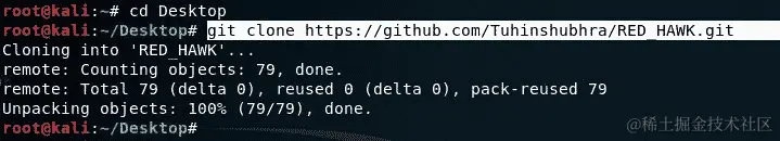 在新的终端中,更改到桌面(或您选择的目录)并通过输入github.com/th3justhacker/RED_HAWK来克隆 Red Hawk v2: