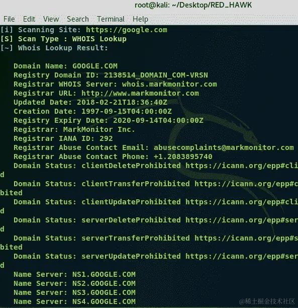 https://www.google.com/的 Whois 查找信息显示如下:
