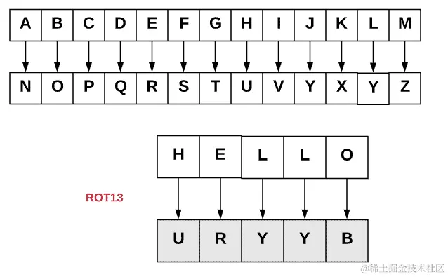 ROT13 是一种替换密码,其中明文中字符的位置向后移动了 13 个位置。因此,如果明文是HELLO,那么密文应该是URYYB,如下所示: