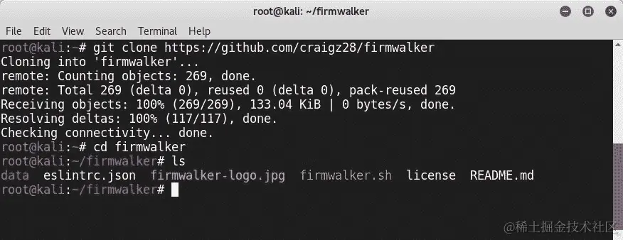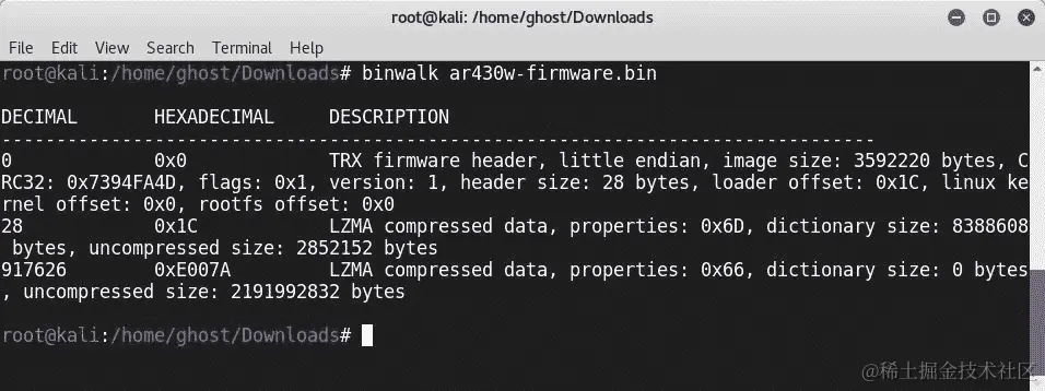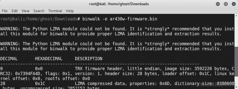 如果您使用 Kali Linux 发行版,可以通过在 CLI 中键入binwalk来直接使用 binwalk: