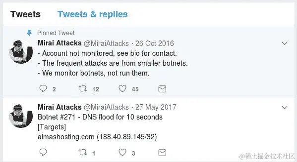 为了更清楚地了解和认识到不安全的物联网的危险影响,让我们深入了解一下影响数百万设备和用户的灾难性攻击之一。那就是 Mirai 僵尸网络。Mirai 在日语中意味着“未来”。它使用数百万受损设备对许多企业和服务提供商进行了分布式拒绝服务(DoS)攻击,包括 DNS、Twitter、PayPal、reddit、Brian Krebs 网站和许多其他知名网站: