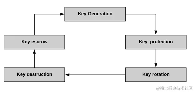 密钥管理是保护加密密钥的过程。为了确保这种保护,必须维护一个生命周期,如下所示: