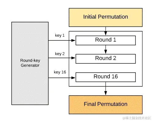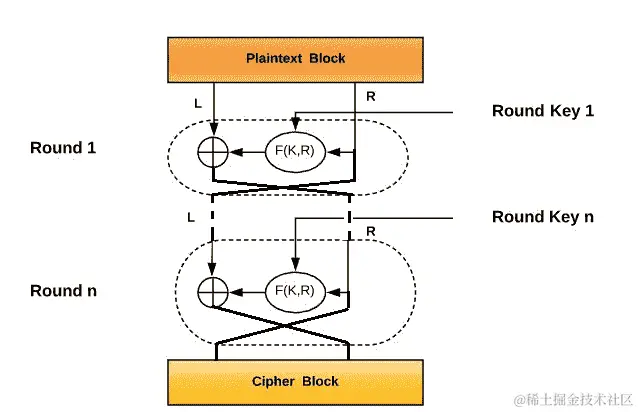 - 分组密码:这些按块处理信息。每个块将分别进行加密和解密。数据加密标准(DES)是最常用的分组密码之一,基于费斯特尔密码,由 IBM 研究员 Horst Feistel 开发,试图构建实现克劳德·香农的替换-置换(S-P)网络的理想分组密码结构。以下图表说明了费斯特尔结构: