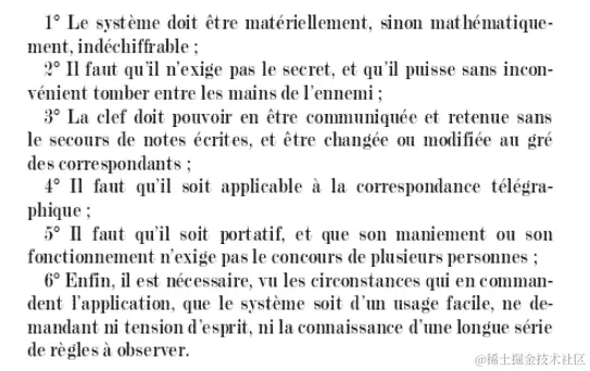 为了检查您是否拥有一个良好和安全的加密系统,一位名为奥古斯特·克克霍夫的荷兰密码学家提出了一套用于设计安全加密系统的法律和原则。这些文章发表在 1883 年的一篇文章中,军事密码学。如果您想阅读完整的文本,请查看奥古斯特·克克霍夫,《军事密码学》,《军事科学杂志》,第九卷,第 5-38 页 II,军事密码学的 Desiderata,1883 年 1 月。克克霍夫的密码系统六原则如下: