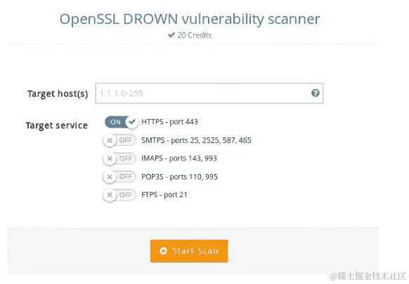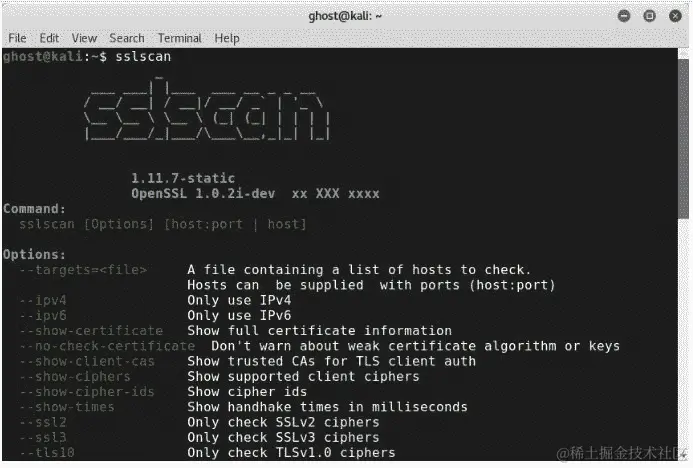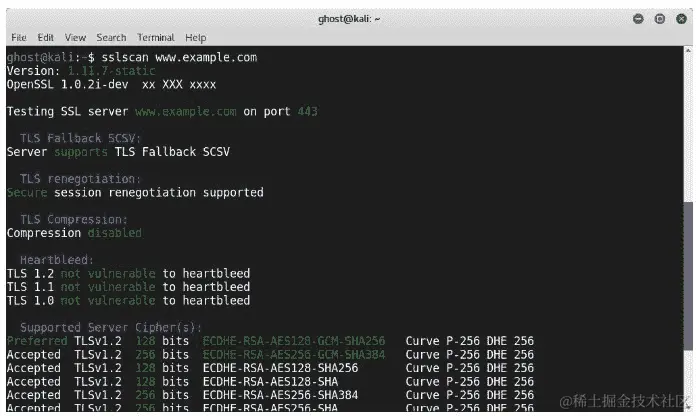 将数据作为纯文本传递代表着你的物联网项目面临巨大的风险。加密数据始终是避免数据被拦截的最佳方法。有许多标准的加密技术和协议,如 SSL 和 TLS。你可以使用一个名为sslscan的工具来扫描你的项目,这是 Kali Linux 中的一个内置工具:
