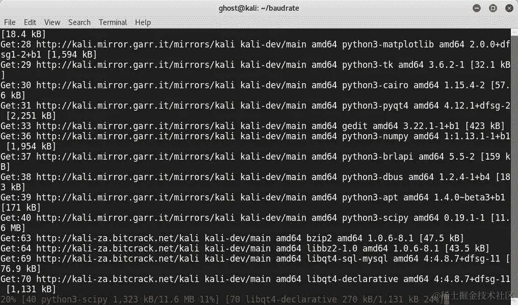 上图说明了用 USB 电缆连接的引脚。您需要找到波特率,它类似于比特率(每秒的位数),但它是每秒的信号变化次数。换句话说,它是每秒符号的信息变化次数。要识别设备的波特率,您可以使用 Craig Heffner 在 GitHub 链接中开发的脚本:github.com/devttys0/baudrate/blob/master/baudrate.py。一旦获得合适的波特率,就可以连接到设备。
