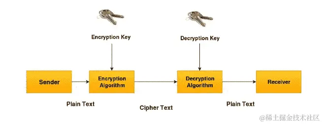 加密技术的实施被称为密码系统;有时也被称为密码系统。以下图表描述了一个简单的密码系统。发送者使用加密算法对明文进行加密,这是一个使用加密密钥的数学过程。该操作的输出生成一个密文,接收者将使用解密算法和解密密钥对其进行解密,使密文可读为明文: