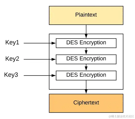 - 三重 DES(3DES):这种加密是 DES 的增强版本。它使用 168 位密钥,因为用户生成三个密钥,k1、k2 和 k3。第一个密钥 k1 用于加密单个 DES。第二个密钥 k2 用于解密第一步的输出。最后一个密钥 k3 用于加密上一步的单个 DES: