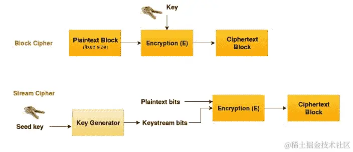 - 流密码:这些按位或按字节处理信息,在加密和解密中。例如,要加密一条消息,会使用一个与消息大小相同的种子密钥生成一个密钥流,然后进行加密。以下图表说明了两种密码类别: