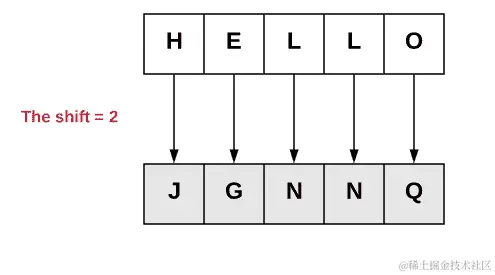 凯撒密码是由朱利叶斯·凯撒使用的替换密码,其中明文消息的每个字符都向前移动了预定义的位置数。举个例子,假设移动的数字是2,那么HELLO的密文将是JGNNQ,如下所示。这种密码很容易被破解,你可以尝试最多 25 次移位,直到找到可读的文本: