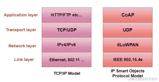 与 TCP/IP 模型类似,物联网项目有自己的套件和表示,名为 IP 智能对象协议套件: