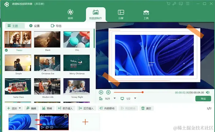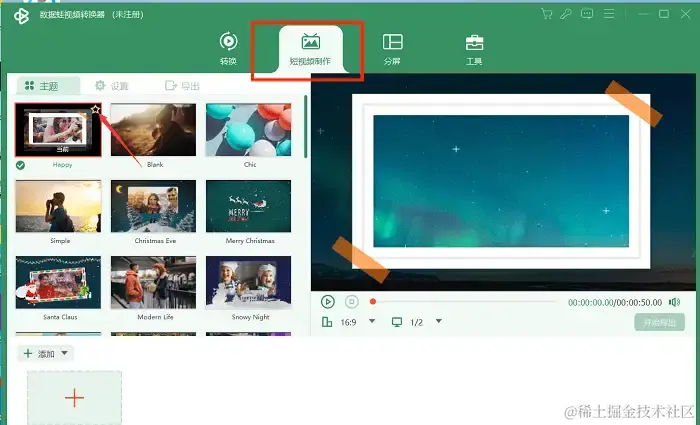 第2步:点击初始界面上方的【短视频制作】,在该界面中选择自己想要的主题(用鼠标单击选择主题,选择后可预览主题样式,觉得该主题不错的话也可单击主题画面右上角的五角星号将其添加到收藏夹中),确定好你所需的短视频主题。