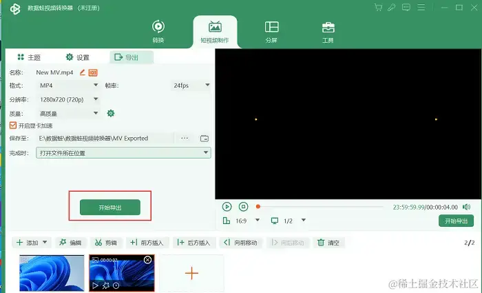 第5步:视频制作完成之后,单击【导出】,设置好视频的名称、格式分辨率、保存位置、质量等等内容,最后点击【开始导出】,这样一个属于你的短视频就出来啦!