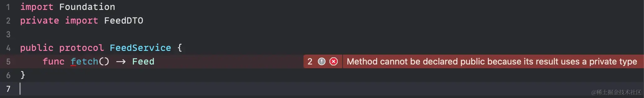 尽管上述代码是朝着正确方向迈出的一步,但代码中没有明确说明 FeedDTO 模块在此文件中的用法是实现细节,不应该是模块的公共接口的一部分。这就是 Swift 6 的功能派上用场的地方。