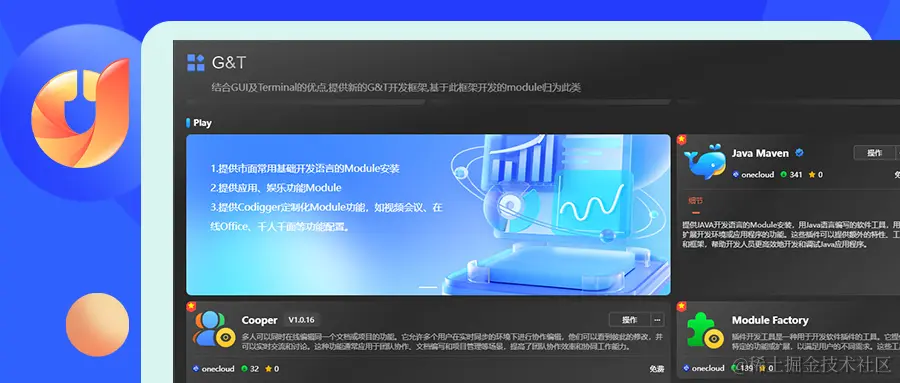 G&T:结合了图形用户界面(GUI)和终端(Terminal)的各自优势,我们创新地推出了G&T开发框架。在此框架下开发的模块,不仅能够充分发挥GUI的直观性和Terminal的强大命令处理能力,还为用户提供了全新的开发体验。其中包括有:Bundle,支持Module目标集成和项目管控的高度自由定制开发套件;Play,此类Module含市面常用基础开发语言的安装,也可以含提供应用、娱乐功能的module,以及还有Codigger定制化Module功能,如视频会议、在线Office、千人千面等功能配置;Editor,含G&T的编辑器;Cockpit,含Cobot(AI辅助编程,问题回答)提升代码编程效率等module;Scenery,G&T的开发场景。