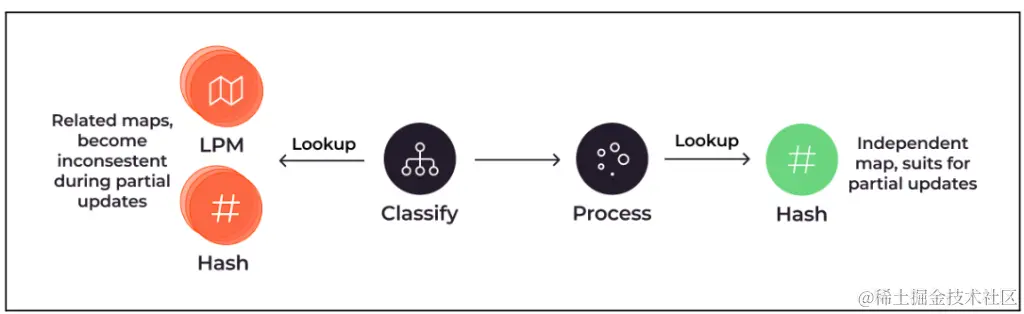 由于内核安全验证,eBPF 映射条目无法存储指向任意内存段的直接指针,这需要使用搜索键来访问映射条目,从而减慢查找过程。但此缺点提供了一个好处:它允许我们将复杂的配置树划分为更小、更易于管理的段,直接链接到配置根。结果是什么?一致性,即使在非原子更新期间。