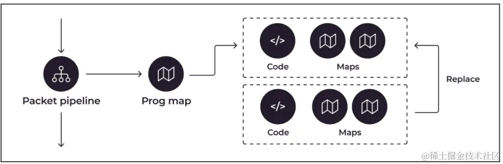 数据包管道到程序映射流程图,导致 eBPF 程序的可替换代码和映射包。