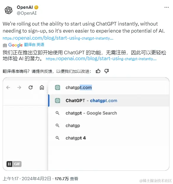 重磅!2024年4月起,openai宣布ChatGPT3.5不用登录即可使用,大家可以把GPT当成搜索网站来用啦,使用门槛大幅降低~