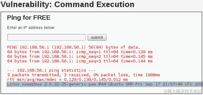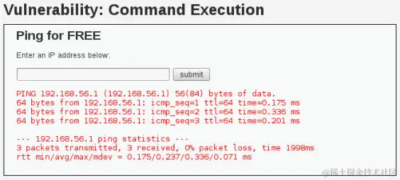 Ping for FREE表单,试试它吧。Ping192.168.56.1(在主机网络中,我们的 Kali Linux 的 IP)。这个输出看起来像是直接的 ping 命令的输出。这表明服务器使用 OS 命令来执行 ping。所以它可能存在 OS 命令注入。