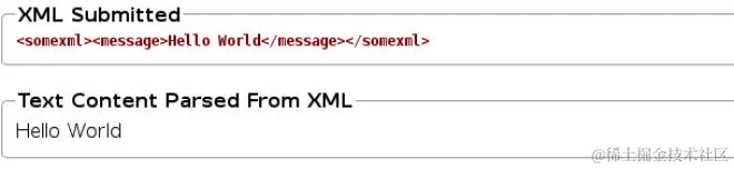 上面写着它是个 XML 校验器。让我们尝试提交测试示例来观察发生什么。在 XML 输入框中,输入