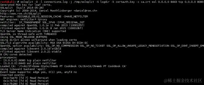 sslsplit -D -l connections.log -j /tmp/sslsplit -S logdir -k certauth.key -c ca.crt ssl 0.0.0.0 8443 tcp 0.0.0.0 8080 -