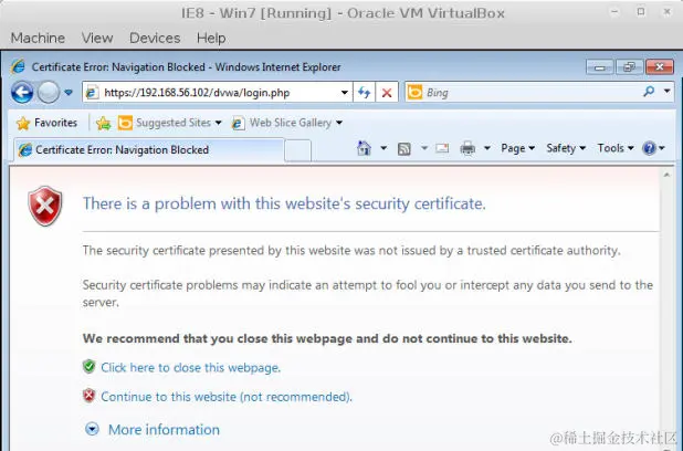 现在,SSLSplit 正在运行,Windows 客户端和 vulnerable_vm 之间存在 MITM,来到客户端并访问