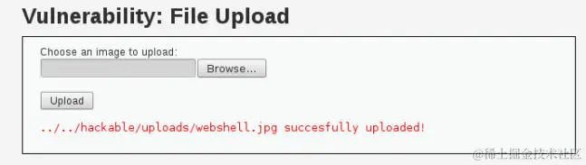 我们会上传一些文件给服务器,但是你需要记住它们储存在哪里,以便之后调用。所以,在 DVWA 中访问Upload并上传任何 JPG 图像。如果成功了,他会告诉你文件上传到了../../hackable/uploads/。现在我们知道了用于储存上传文件的相对路径。这对于秘籍就足够了。
