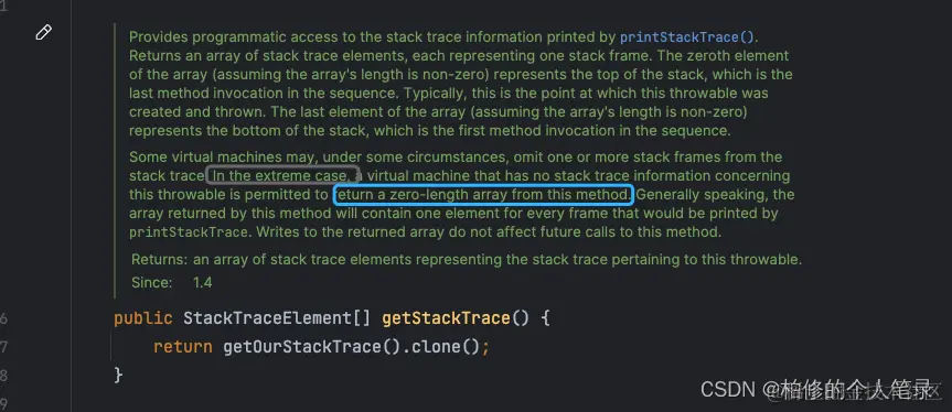 巴拉巴拉说了很长.发现有这么一段话.In the extreme case. a virtual machine that has no stack trace information concerning this throwable is permitted to return a zero-length array from this method.平时喜欢学外语的朋友都知道.这段话:在极端场景下.虚拟机考虑到堆栈信息可能被允许返回一个空数组从这个方法.我草,这是什么鬼.一时间发现这还是我写的那个 Java 吗 ???