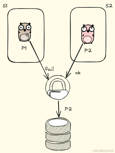 - P2获取分布式锁,处理业务逻辑。