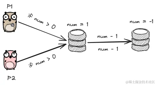 P1,P2两个进程同时进行库存扣减操作,同一时刻读取数据库库存为1,此时符合进程内扣减库存要求,执行扣减操作,最后数据库扣减两次库存,造成超卖。