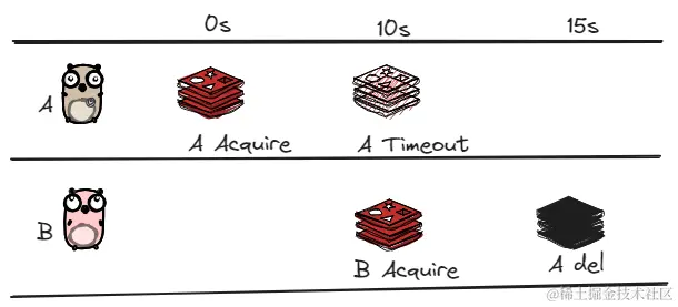 - 10S后,锁到期,此时进程A在访问共享资源。