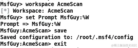 大多数时候,我忘记切换到为特定扫描创建的工作区,最终将结果合并到默认工作区中。但是,使用 Metasploit 中的save命令可以避免这样的问题。假设您已经切换了工作区并自定义了提示符和其他内容。您可以使用save命令保存配置。这意味着下次启动 Metasploit 时,您将得到与上次相同的参数和工作区,如下面的屏幕截图所示: