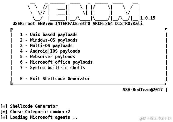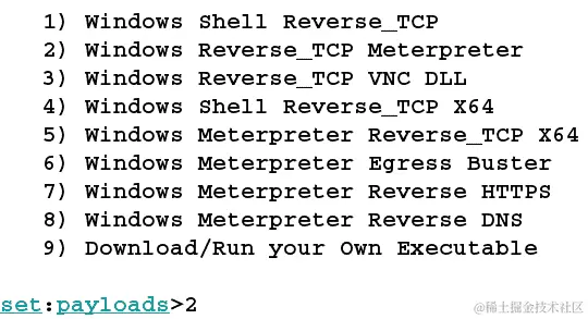 接下来的数字是2,表示有效载荷类型为Windows Reverse_TCP Meterpreter,如下面的屏幕截图所示: