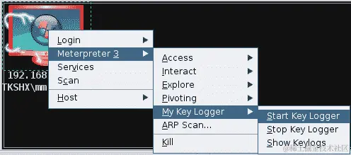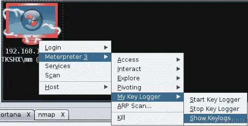 我们可以看到,每当我们右键单击受损的主机并浏览 Meterpreter 3 菜单时,我们将看到一个名为 My Key Logger 的新菜单列在所有菜单的底部。此菜单将包含我们在脚本中声明的所有项目。每当我们从此菜单中选择一个选项时,相应的命令将运行并在 Cortana 控制台上显示其输出。让我们选择第一个选项“启动键盘记录器”。等待一段时间,让目标输入一些内容,然后从菜单中选择第三个选项“显示键盘记录”,如下面的屏幕截图所示: