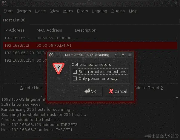 下一步是将路由器地址添加到目标 2,将受害者添加到目标 1。我们将路由器用作目标 2,将受害者用作目标 1,因为我们需要拦截来自受害者并发送到路由器的信息。