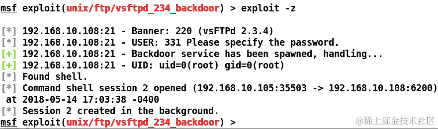 有时,我们不需要即时与受损主机进行交互。在这种情况下,我们可以指示 Metasploit 在利用服务后立即将新创建的会话放入后台,使用-z开关,如下所示: