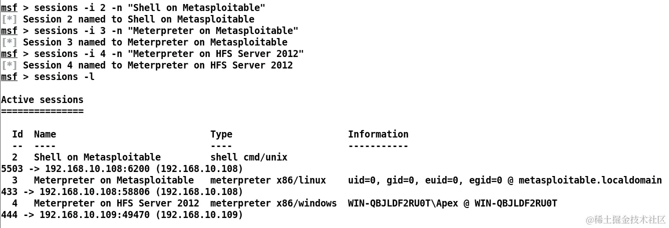 在一个庞大的渗透测试场景中,我们可能会得到大量的系统和 Meterpreter shell。在这种情况下,最好为所有 shell 命名以便于识别。考虑以下情景: