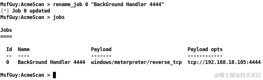 我们可以看到,我们可以使用-p开关来定义有效载荷,使用-H和-P开关来定义主机和端口。运行处理程序命令将快速生成一个处理程序作为后台作业。说到后台作业,它们也可以使用rename_job命令进行重命名,如下面的屏幕截图所示: