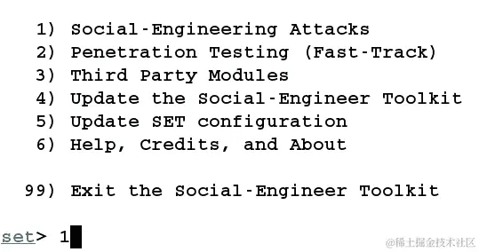 脚本中的第一个数字是1。因此,在处理1时选择了社会工程攻击选项: